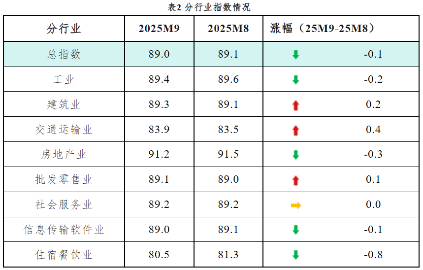 分行业指数3升1平4降。如下表所示,9月份,建筑业、交通运输业和批发零售业的指数分别较上月上升0.2、0.4和0.1个点。社会服务业指数与上月持平。工业、房地产业、信息传输软件业和住宿餐饮业的指数分别较上月下降0.2、0.3、0.1和0.8个点。